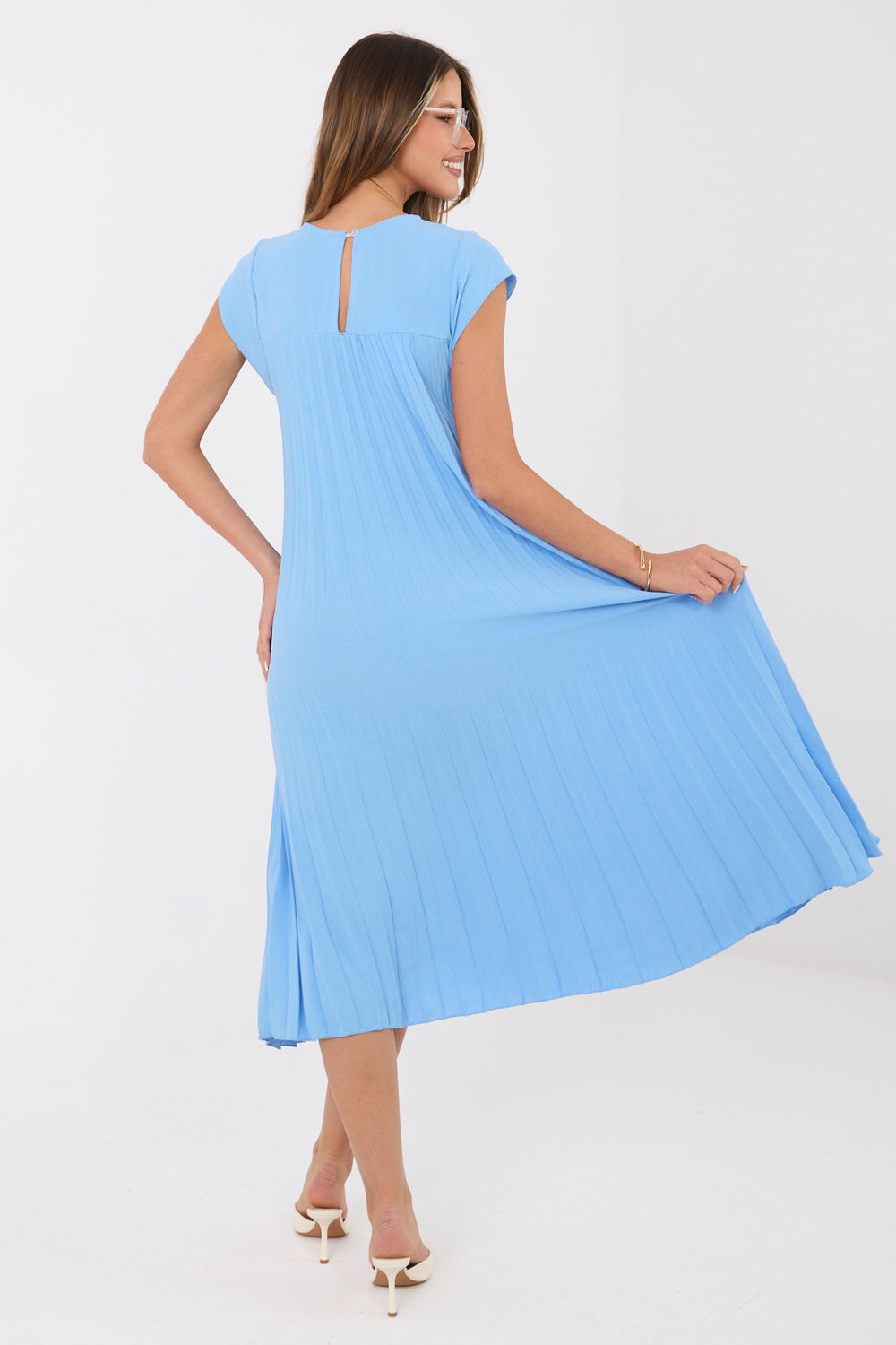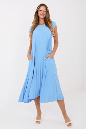 Μια κομψή πλισέ φόρεμα με διαχρονικό χαρακτήρα, που θα φαίνεται εξαιρετική σε πολλές στυλιστικές επιλογές, από τη δουλειά και τις επίσημες συναντήσεις έως τις ιδιαίτερες περιστάσεις και τις εξόδους. Το μοντέλο έχει μήκος midi και είναι κατασκευασμένο από λείο ύφασμα που αγκαλιάζει απαλά τη σιλουέτα, ενώ το πλισέ κάτω μέρος προσθέτει ελαφρότητα και γυναικεία χάρη. Το φόρεμα διαθέτει στρογγυλή λαιμόκοψη και είναι χωρίς μανίκια, δίνοντάς του έναν καθολικό και μοντέρνο εμφάνιση. Στο πίσω μέρος υπάρχει κουμπί που διευκολύνει το φόρεμα και αποτελεί μια αισθητική λεπτομέρεια. Ένα επιπλέον πλεονέκτημα είναι οι πρακτικές τσέπες που είναι κρυμμένες στις πλευρές, οι οποίες αυξάνουν τη λειτουργικότητα του μοντέλου. Κατασκευασμένο από μείγμα πολυεστέρα και ελαστάνης, το φόρεμα προσφέρει άνεση, αντοχή και ελευθερία κινήσεων. Είναι μια στυλάτη και καθολική πρόταση για γυναίκες που εκτιμούν την κομψότητα και την άνεση.