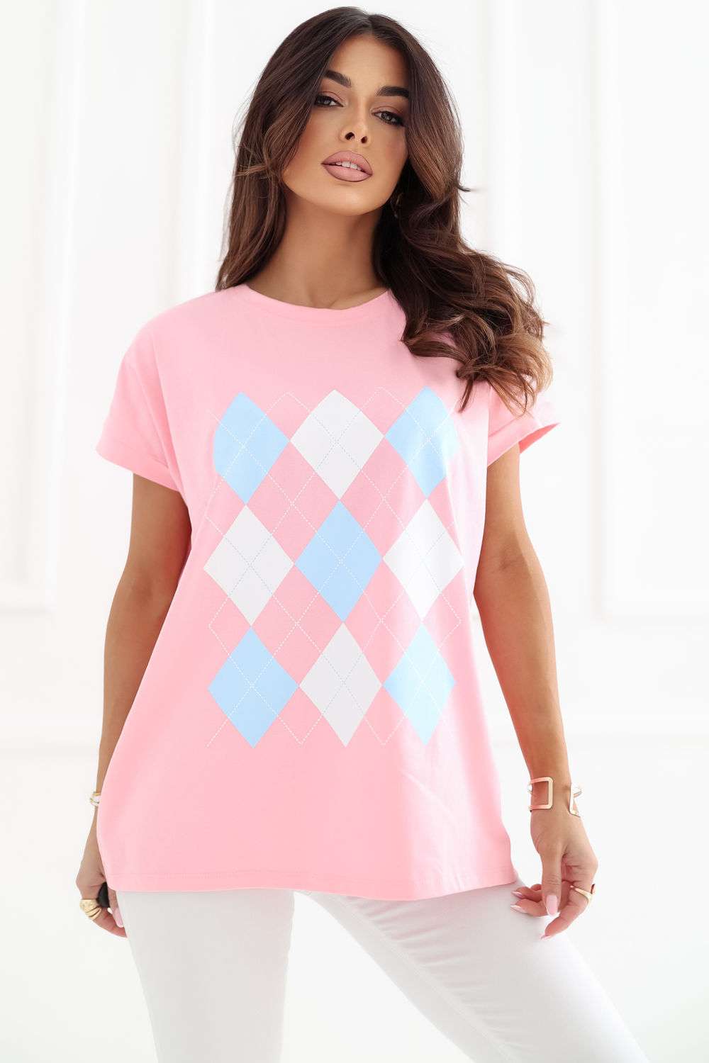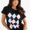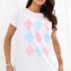 Το γυναικείο μπλουζάκι καθημερινής φύσης είναι μια άνετη και στυλάτη πρόταση για διάφορες περιστάσεις. Κατασκευασμένο από ευχάριστο στην αφή μείγμα βαμβακιού και ελαστάνης, προσφέρει άνεση κατά τη διάρκεια της χρήσης, καλή διαπνοή και ελαφριά ελαστικότητα, χάρη στην οποία προσαρμόζεται στη σιλουέτα. Το μοντέλο ξεχωρίζει για το γεωμετρικό του σχέδιο, που του δίνει σύγχρονο και εκφραστικό χαρακτήρα. Το κανονικό μήκος καθιστά το μπλουζάκι ιδανικό τόσο για παντελόνια όσο και για φούστες. Τα κοντά μανίκια και η στρογγυλή λαιμόκοψη τονίζουν διακριτικά τη γυναικεία σιλουέτα, προσθέτοντας μια αίσθηση ελαφρότητας σε όλη τη στυλιζαρισμένη εμφάνιση. Η απουσία κλεισίματος αυξάνει την άνεση στη χρήση και διευκολύνει την τοποθέτηση του μοντέλου. Είναι ένα универсальное μπλουζάκι ιδανικό για καθημερινή χρήση, εξαιρετικό τόσο για δουλειά όσο και για λιγότερο επίσημες εξόδους.