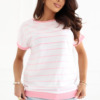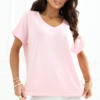 Η καθημερινή μπλούζα κανονικού μήκους είναι μια άνετη και στιλάτη πρόταση για καθημερινή χρήση. Κατασκευασμένη από μαλακό μείγμα βισκόζης και ελαστάνης, προσφέρει άνεση κατά την φθορά, διαπνοή και λεπτή ελαστικότητα, εξασφαλίζοντας τέλεια εφαρμογή στη σιλουέτα. Το μοντέλο διαθέτει κοντό μανίκι και V-λαιμόκοψη, η οποία υπογραμμίζει διακριτικά τον λαιμό και προσθέτει στη συνολική θηλυκή διάθεση. Στο μπροστινό μέρος, από την αριστερή πλευρά, στο ύψος του στήθους, υπάρχει μια διακοσμητική επιγραφή, που συνιστά μοντέρνο στοιχείο και δίνει στη μπλούζα έναν σύγχρονο αέρα. Η απουσία κλεισίματος καθιστά τη μπλούζα ιδιαίτερα άνετη και πρακτική στην καθημερινή χρήση. Είναι ένα πολυδιάστατο στοιχείο της ντουλάπας, που θα λειτουργήσει εξαιρετικά σε casual στυλ.