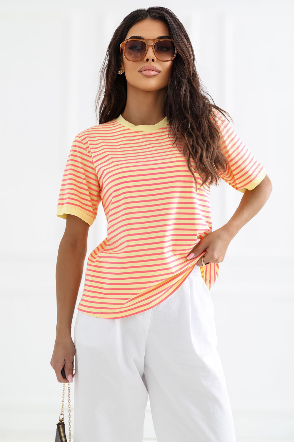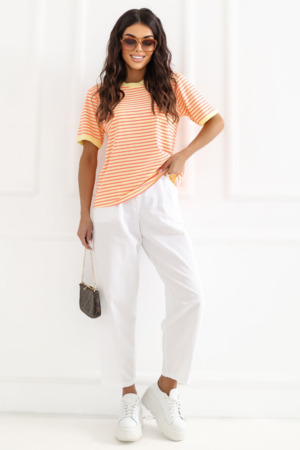 Το γυναικείο μπλουζάκι με ρίγες είναι μια κλασική πρόταση σε casual στυλ, ιδανικό για καθημερινή χρήση. Ο διαχρονικός σχεδιασμός του του δίνει έναν καθολικό χαρακτήρα, κάνοντάς το ιδανικό για πολλές στιλιστικές επιλογές, είτε με τζιν, είτε με φούστα ή σόρτς. Το μοντέλο με κανονικό μήκος, κοντά μανίκια και στρογγυλή λαιμόκοψη προσφέρει άνεση και ελευθερία κινήσεων. Κατασκευασμένο από μαλακό, διαπνέον βαμβάκι, είναι ευχάριστο για το δέρμα και αποδίδει εξαιρετικά κατά τη διάρκεια της καθημερινής χρήσης. Είναι ένα βασικό στοιχείο της γκαρνταρόμπας που συνδυάζει άνεση με ένα απλό, αλλά κομψό εμφάνιση.